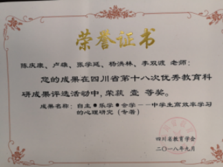 宣漢縣南壩中學主研的“全國(guó)教育科學(xué)‘十二五’規劃2012年度教育部青年課題《學(xué)生高效率學(xué)習的心理研究》(課題批準号:EBA120334)”課題組研究成(chéng)果專著《自主 樂學(xué) 會(huì)學(xué)——中學(xué)生高效學(xué)習的心理研究》獲得四川省教育學(xué)會(huì)第十八次優秀教育科學(xué)研究成(chéng)果一等獎以及成(chéng)都(dōu)市教育學(xué)會(huì)第十六屆教育科研成(chéng)果一等獎。該課題研究核心組成(chéng)員有:陳慶康、盧雄、張學(xué)延、李雙渡、金忠、楊洪林、孫澤萍、陳建中、尹國(guó)華、何高明、周志、巴小坤、何麗、張光偉(溫江區教育局)、鄒小晔、熊剛、董成(chéng)亮、任蒼松、劉延金、張灏、宗羽、塗勳志、楊永清、李躍先、劉永生、杜雪紅、高婧、黃維恒、朱惠、王發(fā)光、楊進(jìn)、趙暢、溫麗翠、楊菊、楊劼、楊磊、陳靜、羅傑、姚琦、張友帆、倪鍾傑、張斌輝、劉攀、張君、唐學(xué)潤、周益、嚴小川、王煜、彭鏡成(chéng)、楊川、張麗(甘孜州康定一中)、鄧強、劉鴻(體育組)、楊敏、高婧、羅曉梅等。